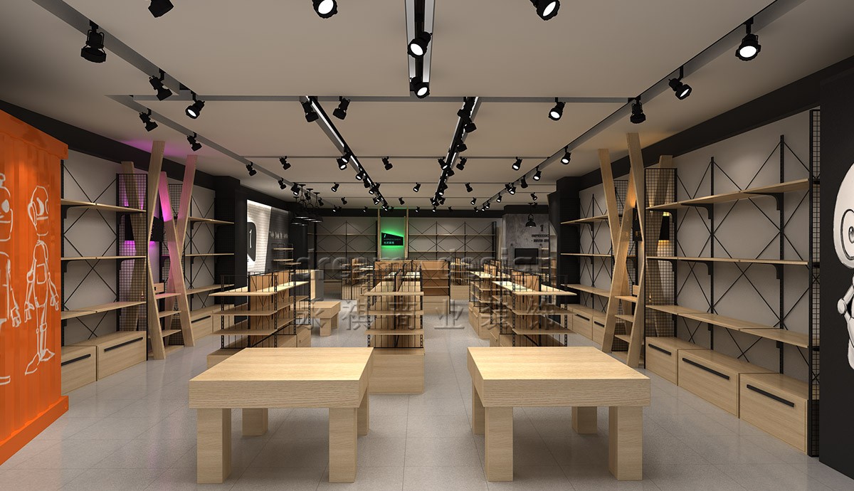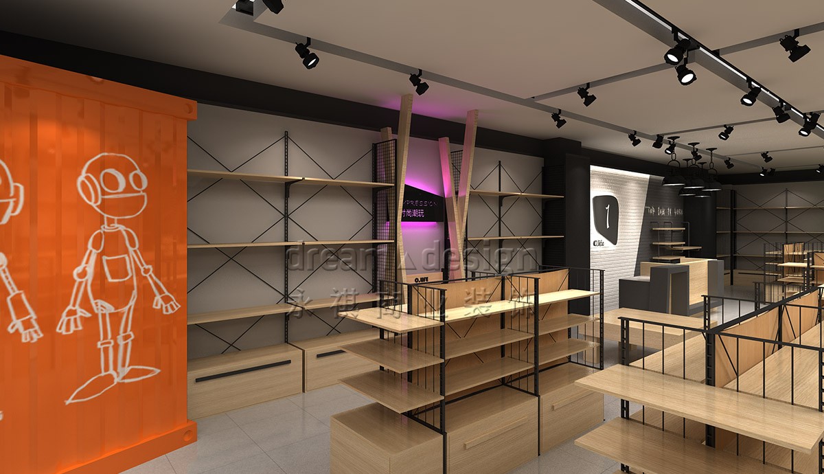 為了打造出當下最流行最FASHION的時尚用品專營店,永祺設計師采用大塊橙色面積的集裝箱、黑白相見的文化磚墻、各款異型時尚柜型來營造氣氛,店面給人的整體效果動感時尚、富有個性,符合潮玩一族的購物心理審美要求。