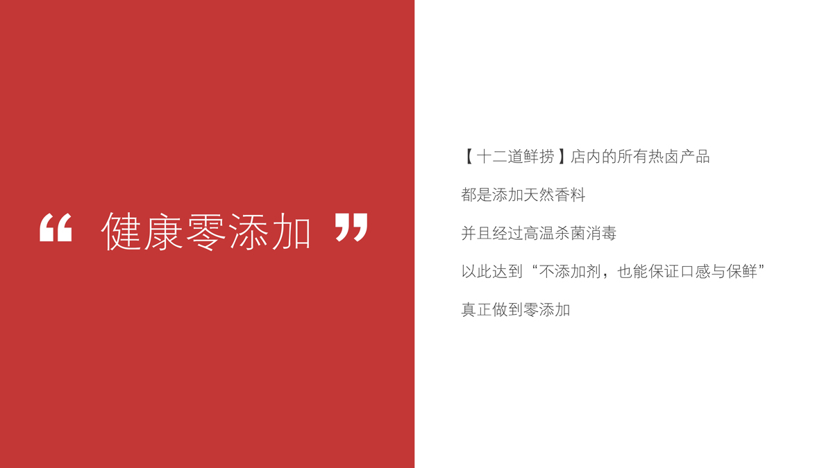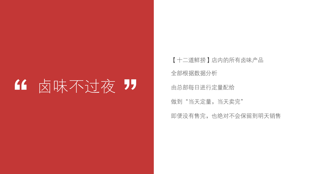 通過調(diào)研與分析,可以發(fā)現(xiàn),長沙雖然不缺乏熱鹵產(chǎn)品與品牌,但是多數(shù)品牌的發(fā)展尚處于起步階段,產(chǎn)品同質(zhì)化非常嚴(yán)重,品牌定位模糊,真正優(yōu)秀的品牌尚未出現(xiàn)。我們將【十二道鮮撈】定位為:每日鮮鹵,重點(diǎn)突出“鮮”,建立產(chǎn)品差異化。根據(jù)“當(dāng)天熱鹵,當(dāng)天賣”的口號,我們?yōu)椤臼栗r撈】制定了三大產(chǎn)品標(biāo)準(zhǔn):鹵味不過夜、鹵汁不回收、新鮮零添加。
