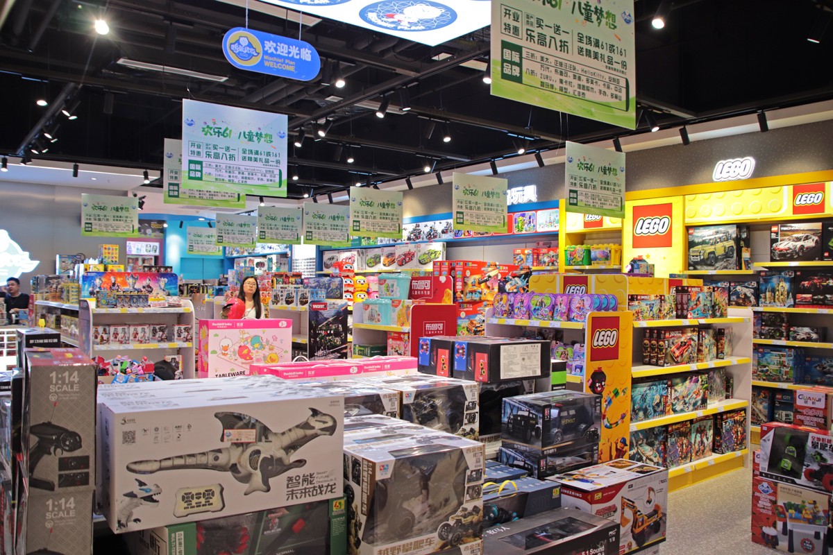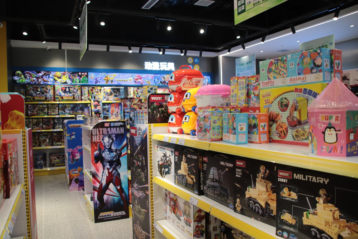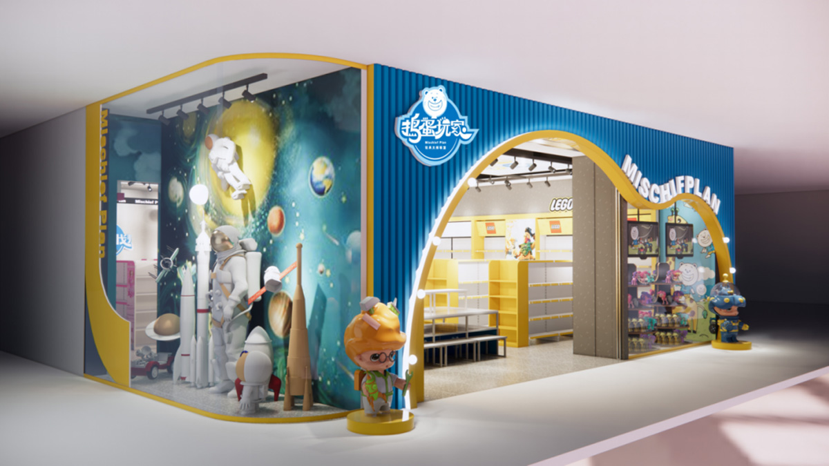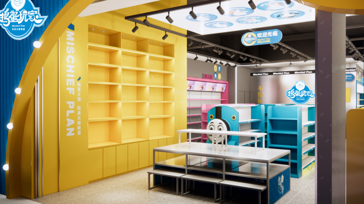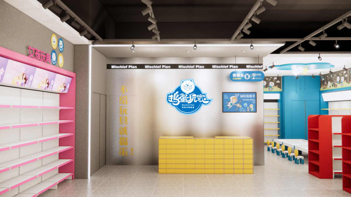 永祺根據(jù)客戶追求玩具體驗的需求,搗蛋玩家整個空間以藍(lán)色+黃色為主,各類玩具用不同顏色作區(qū)分方便尋找。展示櫥柜展示時下最流行的大型玩具,呈現(xiàn)一個好看,好玩的玩具體驗空間。
