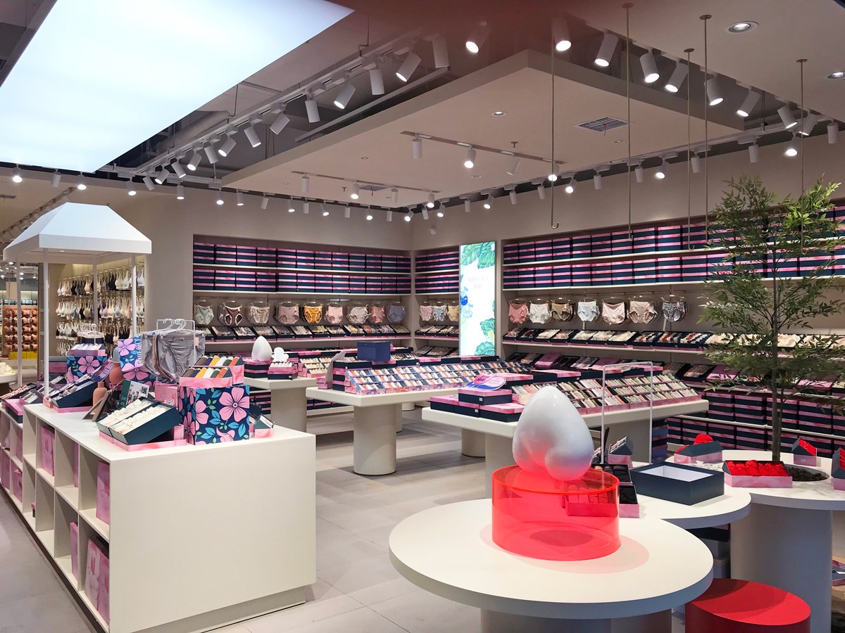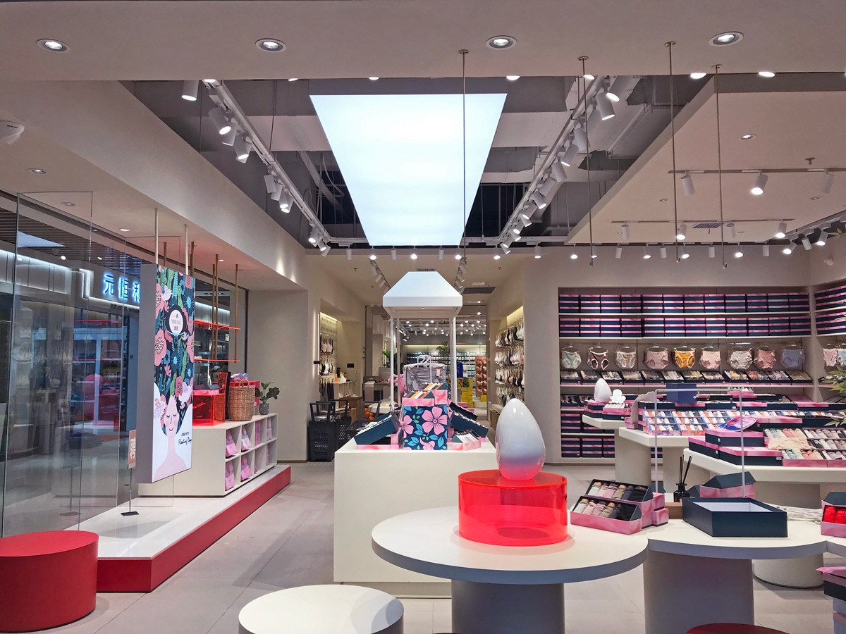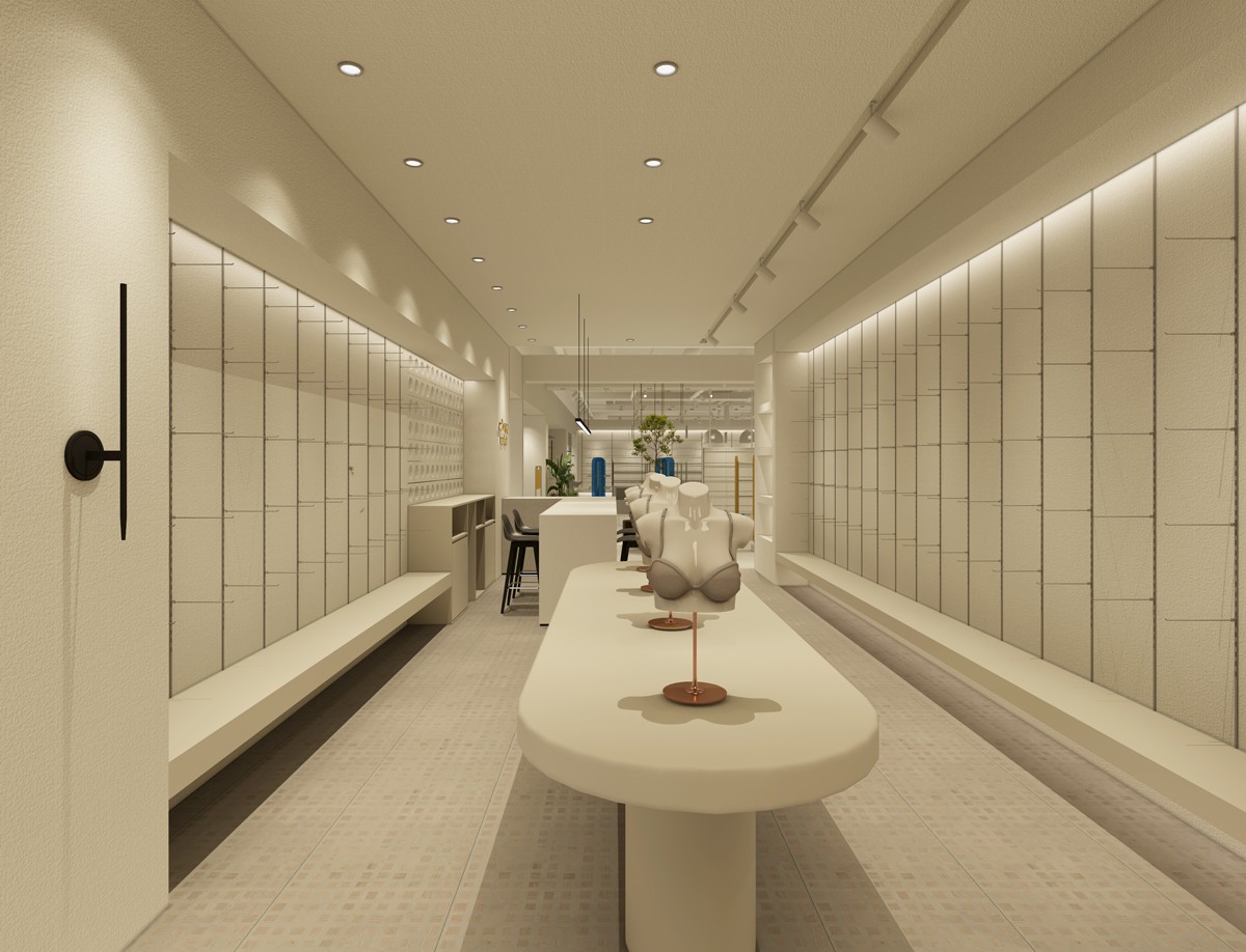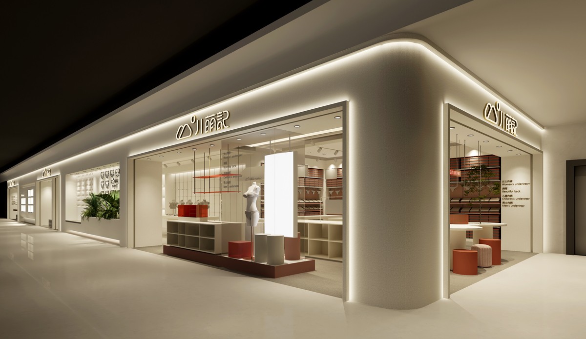 于萌記這類的內(nèi)衣服品牌,終端門店形象格外需要吻合女性為主的消費群體需求,整體的氛圍感與細(xì)節(jié)的精致感是必不可少的設(shè)計元素。對此,該案例門店形象以聚射燈光與照明燈光搭配渲染空間氛圍,以圓與方的幾何擺臺強化空間層次,越簡約越精致的空間效果,提高了商品陳設(shè)的美感,營造出店面更輕松愉悅的消費環(huán)境