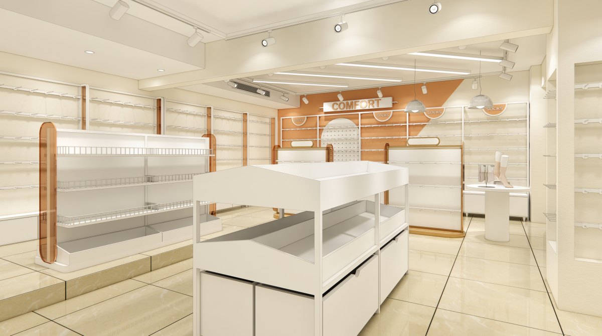 主營針織產(chǎn)品,數(shù)量種類多,陳列要求比較高,顏色統(tǒng)一是橙黃色調(diào),整體比較亮眼和協(xié)調(diào)。如何最大程度滿足陳貨量,區(qū)域劃分清晰明確,成為了我們這次設(shè)計的重點。 店鋪分為兩層,一層毛巾區(qū)域:采用白色搭配原木色的貨架,簡約干凈,分類明確空間燈光明亮,突出產(chǎn)品,激發(fā)購物欲望。二樓針織展廳:多種類別服裝道具使陳列展示效果最大化,顏色搭配使區(qū)域分類明確,突出品牌的理念和質(zhì)感。
